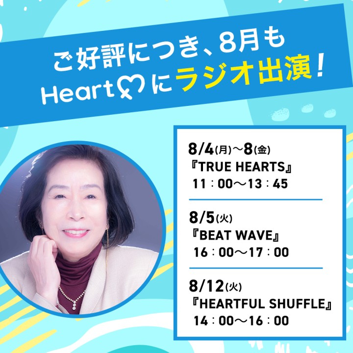 ラジオ番組 HeartFMへの出演が、8月も決定いたしました!
