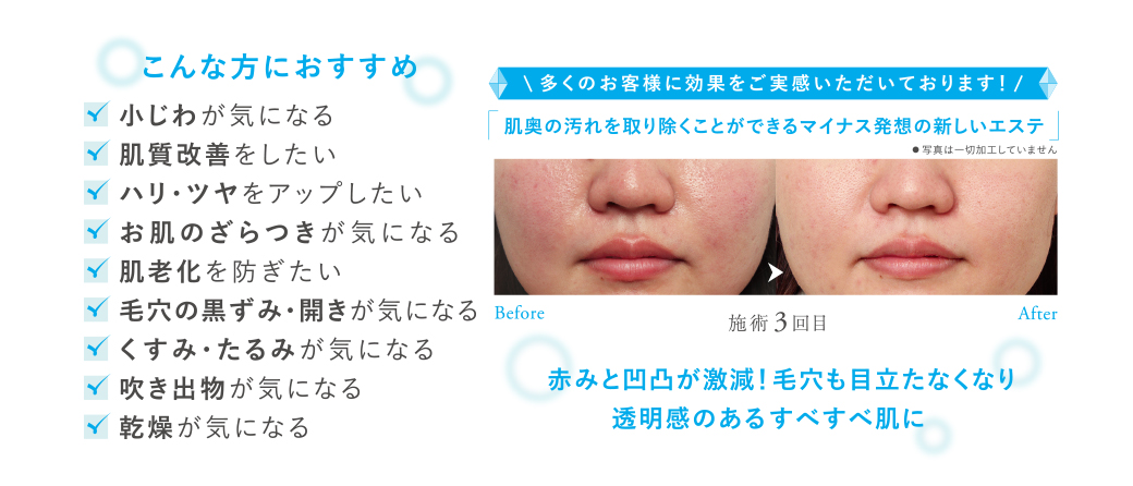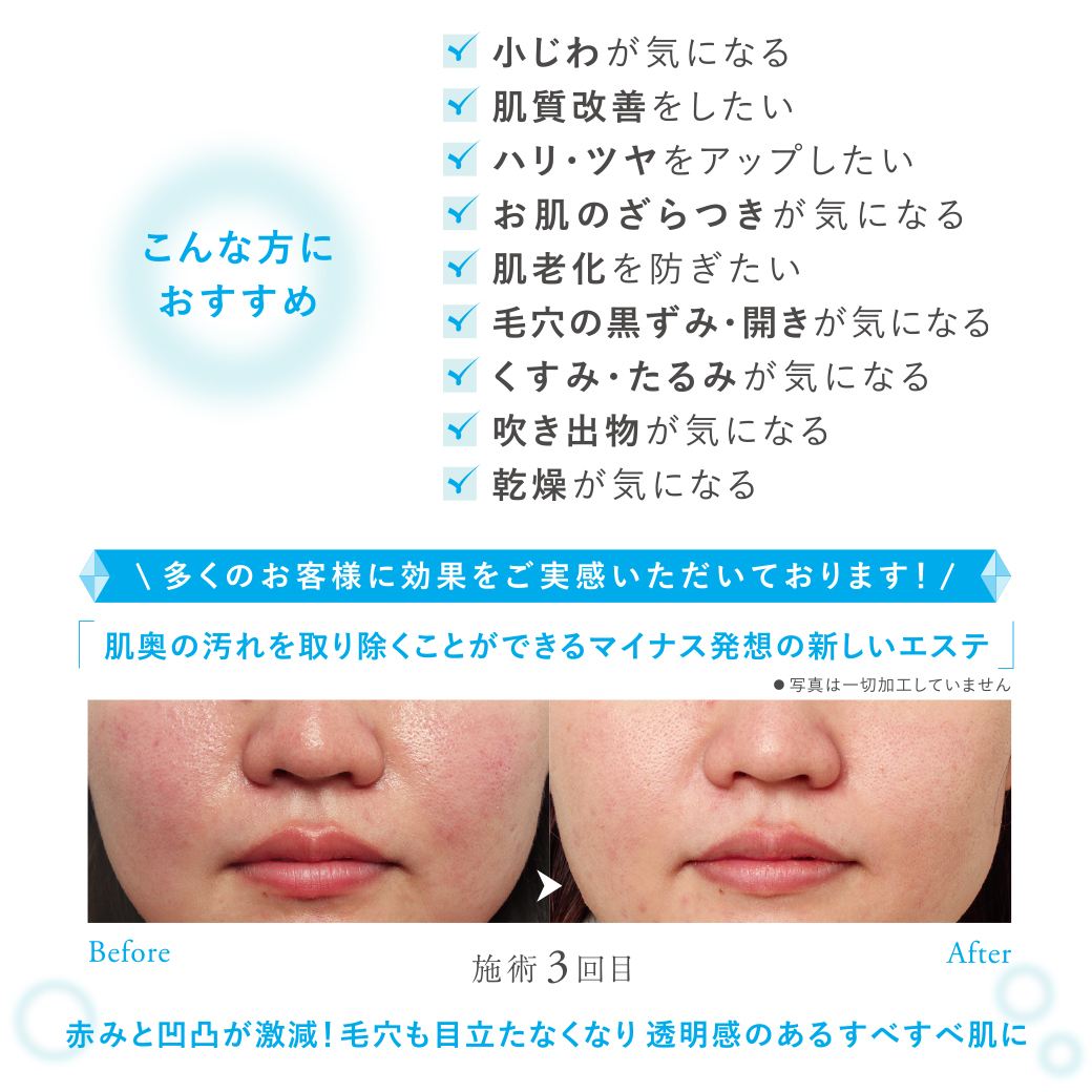お肌にはたくさんの化粧汚れや老廃物が蓄積しています。洗顔や毛穴洗浄では取れない肌深部の汚れを除去する施術です。