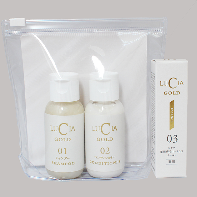 【セット内容】 | ルチアシャンプーゴールド・コンディショナー(各40ml)、ルチア薬用育毛エッセンスゴールド(18ml) |