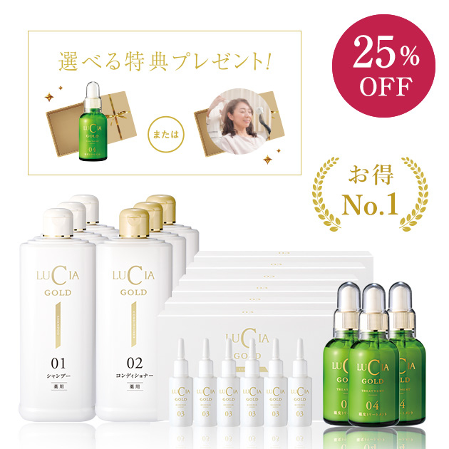 【初回限定】ゴールドシリーズをはじめてご購入の方限定価格!シャンプー・コンディショナー・育毛エッセンス・頭皮トリートメント・書籍2冊のお得な6点セットです。