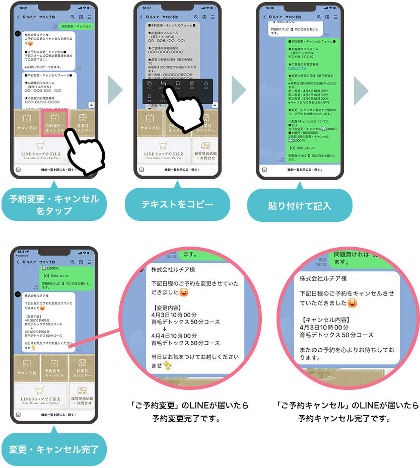 ②『■予約変更・キャンセル■』のテキストをコピーして、『〇』の部分に必要事項をご記入ください。